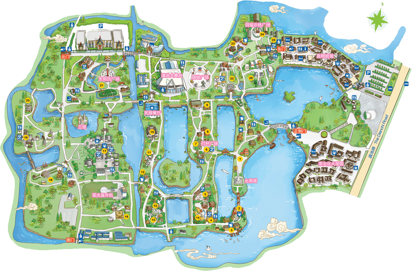 彝族在云南境內(nèi)約471萬人,是省內(nèi)人口最多、分布最廣的少數(shù)民族,主要聚居在金沙江、元江流域和哀牢山、無量山腹地。彝族是一個能歌善舞的民族,民間打歌、跳樂之風盛行,大三弦、跌腳舞久負盛名?;鸢压?jié)是彝族最具特色的民族節(jié)日。彝族村占地50余畝,三虎浮雕墻與虎頭內(nèi)祖師形象表現(xiàn)了彝族虎鷹文化。太陽歷廣場圖騰柱上有太陽、虎、火和八卦圖形象,周圍環(huán)繞著10個朝向不同的月球造型,外圓周有12生肖石雕。依山而建的“...