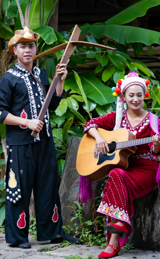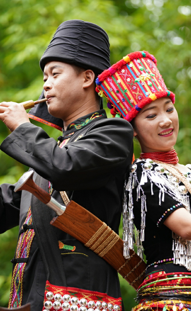 德昂族人口約1.7萬,主要分布在德宏州和保山市的潞西、梁河、瑞麗、隴川、隆陽等縣區(qū)。民居多為草排覆頂竹木結(jié)構(gòu)的干欄式建筑,眼前的德昂村建筑納入了能容納數(shù)十人居住的德昂大房子,氈帽頂?shù)男》孔?,還有頗具浪漫色彩的大公房、小公房……還建有“龍陽塔”標志及佛教奘房、佛塔。德昂族民間普遍信奉南傳佛教,民俗活動與佛事活動關(guān)聯(lián)緊密。潑水節(jié)、開門節(jié)、關(guān)門節(jié)是重大節(jié)日。德昂族服飾色彩豐富,口頭文學特別是民歌創(chuàng)作活動...